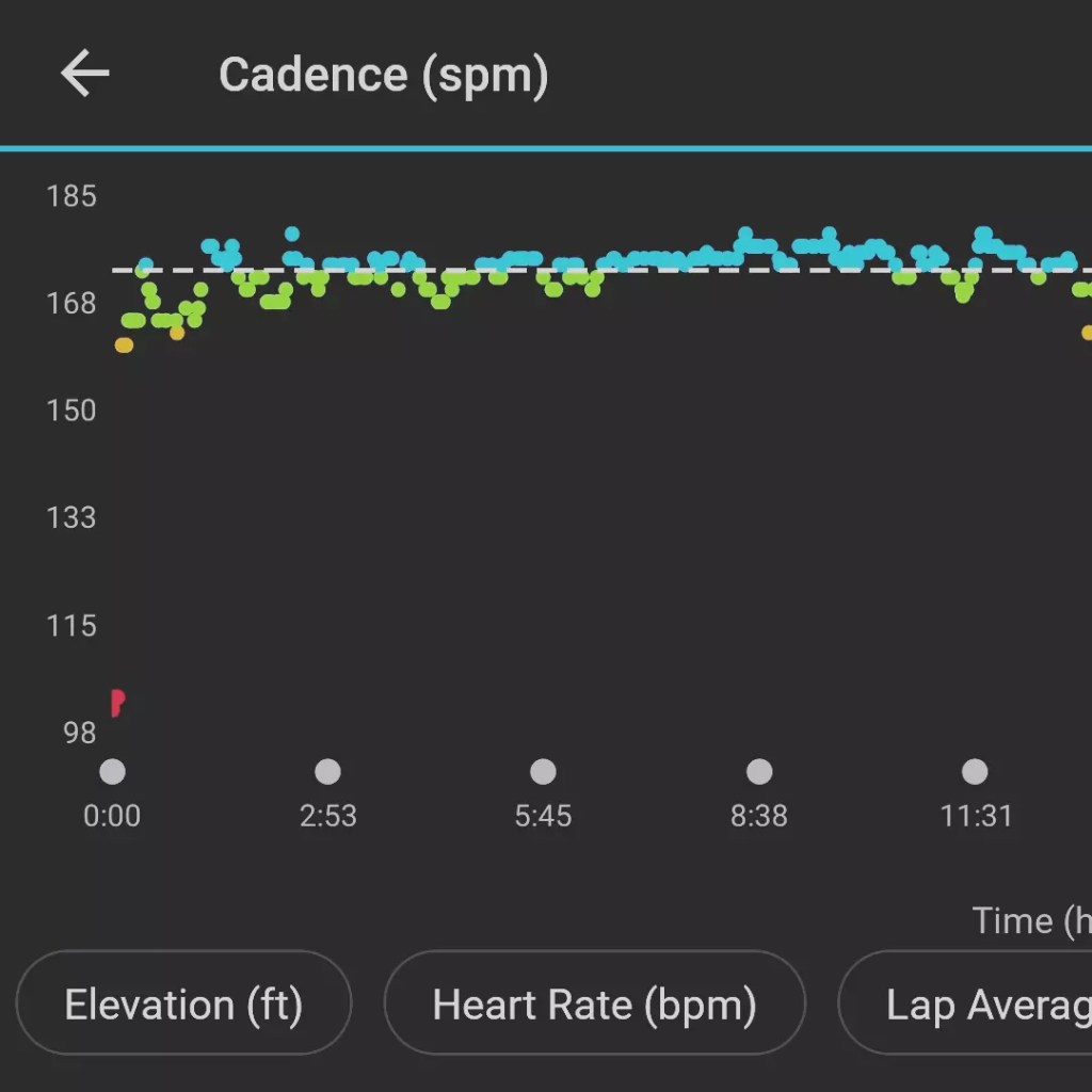 Here you can see my average cadence running for 10 minutes was ~163. I got demoralized and turned my run into an uphill walk. Which was more fun, at least!